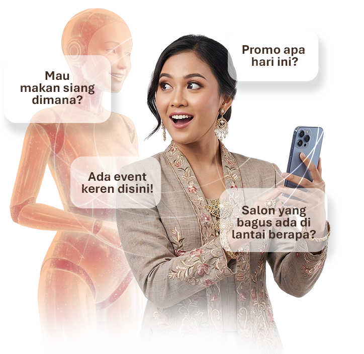 Peta digital, tenant directory, dan navigasi interaktif yang memudahkan pengunjung menemukan toko, restoran, fasilitas, dan event—dipersonalisasi dengan AI.